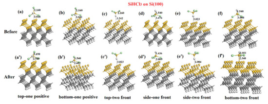 A BCl3 molecule and a SiHCl3 molecule were placed together on the surface of the Si(100) supercell to investigate the adsorption reaction. Figure 6 shows the structural changes before and after the co-adsorption of BCl3 and SiHCl3 on the Si(100) surface. Compared to the structure before adsorption in Figure 6a, it can be concluded from the structure after adsorption (Figure 6b) that the Si atom in the SiHCl3 molecule forms a covalent bond with the B atom in BCl3. A Cl atom in each of the BCl3 and SiHCl3 molecules undergoes a dissociation reaction and is adsorbed on the Si atom at the nearest bridge site on the Si(100) surface. The bond lengths of the other Cl–B bonds in the BCl3 molecule are significantly elongated, and the B atom is adsorbed on the Si(100) surface at the same time. These results indicate that BCl3 and SiHCl3 molecules are placed on the Si(100) surface simultaneously. After the adsorption reaction, it is evident that BCl3 is more easily adsorbed on the Si(100) surface than is SiHCl3. When BCl3 and SiHCl3 coexist on the Si(100) surface, they are more likely to have an effect than SiHCl3 alone on the surface. Moreover, their simultaneous presence there will be accompanied by a dissociation process; in which each dissociates a Cl atom, and the Cl atom in the BCl3 molecule is attracted by the Si(100) surface.