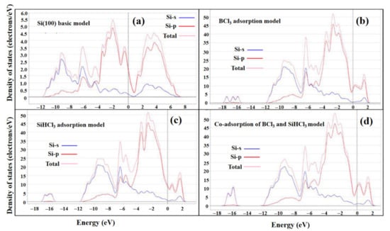 State density changes of BCl3 and SiHCl3 molecules after the adsorption on the Si(100) cell surface. (a) is the density of states of Si(100); (b) is the density of states for the BCl3 adsorption model; (c) is the density of states for the SiHCl3 adsorption model; (d) is the density of states for the co-adsorption of BCl3 and SiHCl3.