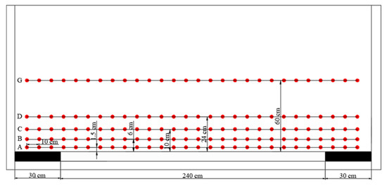 A total of 29 measuring points were arranged for each measuring line, corresponding to A1~A29 to L1~L29, and the horizontal spacing of measuring points was 10 cm. The total station was used to observe the displacement of measuring points during excavation.