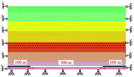 The bottom, left and right boundaries of the model were fixed to limit the boundary movement. In the research of the PCFM, vertical and downward stress at 1.25 MPa, 2.5 MPa and 3.75 MPa were applied on the surface of the model to stimulate the burial depth of 300 m, 350 m and 400 m, respectively. The constitutive model of coal and rock mass selected the Mohr–Coulomb model, and the corresponding joint fracture model was also the Mohr–Coulomb model [37]. A 100 m coal pillar was left on either side of the model separately to reduce the boundary effects caused by the excavation of the model. The working face was filled while it was being mined, and the overall excavation distance of the model was 300 m, with an excavation of 5 m per time.