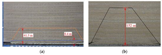 Figure 6 illustrates the physical similarity simulation experiment for the development characteristics of overlying strata fractures in the PCFM and caving mining. It can be seen from Figure 7 that for the caving mining, as the roof strata are stable, overlying strata fractures are barely developed longitudinally at the early stage of working face advance. When the working face was advanced to 40 m, transverse fractures occurred on the immediate roof, which is in the rapid fracture rise area when it is at the middle stage of working face advance (working face advance within 120–200 m). In this area, the height of overlying strata fractures increases in a linear manner. At the end of the working face advance, as the upper overlying strata in the mined-out area are fully disturbed, the lower overlying strata fractures are gradually compacted to form a closure. This makes the upper overlying strata fractures slowly developed and their height tends to be of a stable value. After the whole working face was completed, the development height of longitudinal overlying strata fractures was 152 m. Under the conditions of 2/3 filling mining, the curve pattern of fracture development height was similar to that of caving mining, showing an apparent fracture development at the early stage of advance, rapid fracture expansion stage, and slow rise and stabilization stage. However, different from the caving mining, the working face had a lower fracture development height, and the location where the fracture reached the maximum height is close to the open-off cut. When the working face was advanced to 51 m, the fracture height of the separation layer was 4 m. When the working face was advanced to 147 m, the height of the overlying strata fracture drastically increased to 40 m. Further, in the case of the advance from 147 m to 220 m, the height of overlying strata fracture slowly increased from 40 m to 41.5 m. Under the conditions of 2/3 filling mining, overlying strata fractures can only penetrate through the sub-key stratum to form the dominant longitudinal fracture in the mined-out side. From the above analysis, it can be seen that due to the addition of fillings in the mined-out area, a new “support-surround rock-composite filling body” dynamic working space was formed in the filling stope where the morphology of overlying strata development has new characteristics and fracture height is significantly reduced [38,39,40].