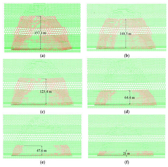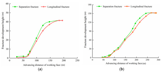 Figure 12 displays the development characteristics of the overlying strata fractures in different burial depth conditions (200 m, 250 m, 300 m, 350 m, 400 m). It can be seen from Figure 12 that the development laws of overlying strata fractures are similar in the working face under different burial depth conditions. As the working face is advanced, the overlying strata are first developed with the horizontal separation fractures and then vertical fractures prevailing. The shallower the burial depth is, the faster the fractures are developed to the maximum height. As the burial depth increases, the development of the overlying strata fractures to the maximum height gradually slows down.