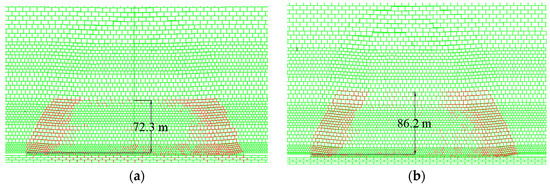 (3) Through the UDEC numerical simulation, the influence characteristics of mining height, filling ratio, and buried depth on the development of overburden fractures in PCFM are studied. The research results show that mining height, filling ratio, and buried depth have a great influence on overburden fractures. With the increase of mining height, the fracture height of the overburden increases linearly with the mining height. When the mining heights of the coal seam are 4 m and 5 m, the fractures are mainly distributed on both sides of the coal wall; when the mining heights of the coal seam are 6 m, 7 m and 8 m, the overburden fractures are mainly distributed on both sides of the coal wall and the upper part of the overburden; when the filling ratios are 1/2, 2/3, 3/4 and 100%, the development height (64.4 m, 47.6 m, 21 m and 5 m) and distribution range of overburden fractures are small. With the increase in the filling ratio of the working face, the fracture height of overburden decreases. The shallower the buried depth is, the faster the crack develops to the maximum height. With the increase of buried depth, the range of overburden fracture zone is also expanding.