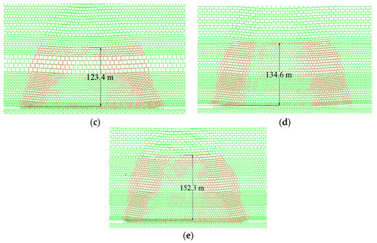 Development characteristics of overlying strata fractures under different mining height conditions. (a) Mining Height 4 m; (b) Mining Height 5 m; (c) Mining Height 6 m; (d) Mining Height 7 m; (e) Mining Height 8 m.