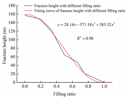 The fit curve of the development height of overlying strata fractures under different filling ratio conditions.