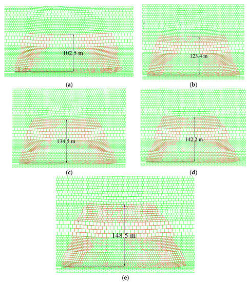 The development characteristics of overlying strata fractures under different buried depth conditions. (a) Buried depth 200 m; (b) Buried depth 250 m; (c) Buried depth 300 m; (d) Buried depth 350 m; (e) Buried depth 400 m.