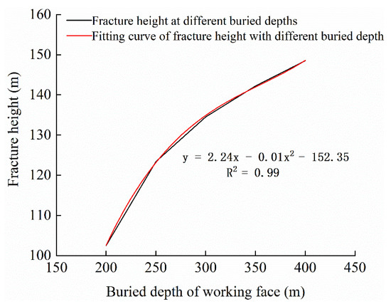 The fit curve of the development height of overlying strata fractures under different buried depth conditions.