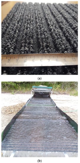 The sands used in this work were obtained from the beaches of the Danube main river channel at approximately 1778 river kilometer, in the southwestern part of Slovakia, near the town of Komárno. For the preparation of the heavy mineral concentrate, a riffle sluice with a total length of 2.8 m was used (Figure 1). The width of the sluice was 41 cm, with the lower two-thirds gradually tapering from a width of 41 to 30 cm. The 1 m × 0.4 m hopper was fitted with a 4 mm × 6 mm mesh slotted screen. The sluice was lined with carpeted partitions arranged in groups of three, with approximately 5 mm between each partition and 1 cm between groups of partitions (Figure 1). The longitudinal slope of the riffle sluice of 5 to 9 degrees was adapted to the amount of incoming water (3.7 to 5.6 m3·h−1), which depended on the type of slurry pump used. One ripping cycle lasted approximately two hours. During the sluicing cycle, the bottom carpet of the sluice was washed at approximately 5–10 min intervals whenever the baffles were filled with concentrate. At the end of the cycle, all carpets were washed into a prepared container.