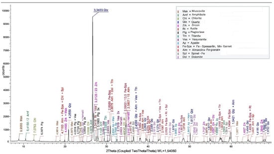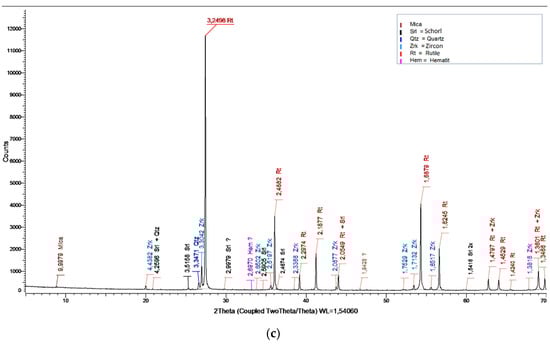 The fine aggregate waste and concentrates were analyzed by X-ray powder diffraction (XRD) to determine their qualitative and quantitative composition. Most samples were analyzed by the diffractometer (XRD; Bruker D2 Phaser, Mannheim, Germany). The XRD patterns of the samples were obtained under the following conditions: CuKα radiation, monochromatic Ni-filter, accelerating voltage of the X-ray generator 30 kV, current intensity 10 mA, area of scan angles: 5–70° 2θ, time/step 0.3 s/0.01°. Processing and interpretation of the XRD record were realized with the Bruker software DIFFRAC EVA V3.1. (Bruker, Billerica, MA, USA) using an internal database of mineral standards Powder Diffraction Files PDF-2/2013 (by IUCr = Database COD) and control reference chart AMS data.