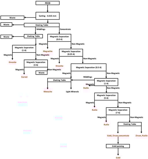 The feed for the main experiment was 1300 kg of the concentrate of heavy minerals sieved below 0.315 mm. The homogenized heavy mineral concentrate was processed on a shaking table. A simplified scheme of the whole experiment can be seen on the process flow diagram on Figure 3.