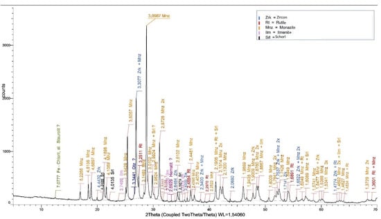 In the first phase, a pilot experiment was carried out, the results of which were published in Ref [21]. A heavy mineral concentrate with a total weight of 73.6 kg, obtained from 300 kg of the deposit (alluvial sandy gravels), was sorted into grain size fractions above 0.5 mm, 0.315–0.5 mm and below 0.315 mm. The fraction above 0.5 mm, weighing 3 kg, represented mainly by quartz and quartzite (85%), limestones and dolomite (10%), metamorphic rocks and sandstones (5%), constituted waste. The fraction 0.315–0.5 mm weighing 12.6 kg and the fraction below 0.315 mm weighing 58 kg were processed on a shaking table (Jiangxi) and on a magnetic separator (Mechanobr) with a gradual increase in magnetic field strength by increasing the value of the saturation current. The representation of the individual minerals in the heavy mineral concentrate in the grain size class 0–0.315 mm from the XRD is shown in Figure 2, and the mineralogical composition of the feed is shown in Table 1.