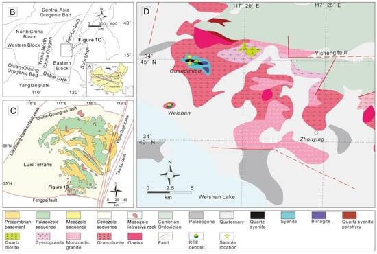 The North China Block (NCB) has undergone a series of geodynamic events since the Mesozoic, including the collision of the NCB and Yangtze plate and subduction of the Izanagi plate, and compression-to-extension tectonic regime transformation, resulting in the thinning of the lithosphere associated with widespread magmatism and ore formation [11,12,13,14,15] (Figure 1A,B). The Luxi Terrane intersects to the east with the Liaocheng–Lankao fault zone, to the west with the Yishu fault zone, to the south with the Fengpei fault and to the north with the Qihe–Guangrao fault, forming an approximate parallelogram [6] (Figure 1C). The exposed formations in the southwest of the Luxi Terrane include Cambrian–Ordovician limestones, dolomites and shales, Palaeogene sandstones, and Quaternary clastic sediments (Figure 1D). The Luxi Terrane of the NCB experienced compressional deformation caused by the subduction of Izanagi plate during the Middle–Late Jurassic (170–135 Ma), resulting in the development of the EW-oriented Yicheng fault and smaller NE- and NW-oriented faults [16]. The magmatic activity is frequent, including Neoarchean, Neoproterozoic and Mesozoic magmatic events [2,10,16,17,18,19], leading to the formation of Precambrian and minor Mesozoic intrusive rocks [2]. Among them, the Mesozoic Yanshanian magmatic activity is relatively extensive and formed various types of magmatic rocks, including quartz syenites, syenites, bistagites and quartz syenite porphyries. Major commodities in the Luxi Terrane include iron, gold and REEs [2,6,20,21,22].