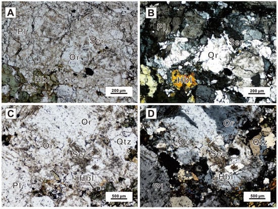 Optical microscopy photomicrographs of the alkaline rocks. (A,B) Quartz syenite (21XC03); (C,D) Quartz syenite (21XC05). Mineral abbreviations: Pl—plagioclase; Or—orthoclase; Hbl—hornblende; Qtz—quartz; Srt—sericite. (A,C) plane-polarized light, (B,D) cross-polarized light.
