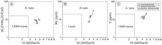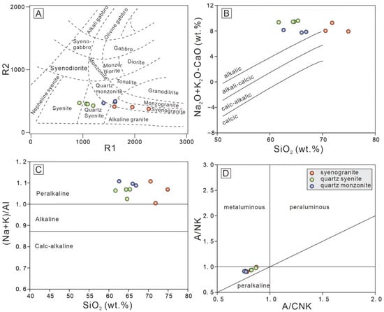 Geochemical classification plots of the syenogranite, quartz syenite and quartz monzonite. (A) R2 (6Ca + 2Mg + Al) vs. R1 (4Si—11(Na + K)—2(Fe + Ti)) plot for classifying the rock types [32]. (B) (Na2O + K2O—CaO) vs. SiO2 [33] classification diagram for evaluating the calcic to alkalic variations. (C) (Na + K)/Al vs. SiO2 plot [34]. (D) A/NK [molar Al2O3/(Na2O + K2O)] vs. A/CNK [molar Al2O3/(CaO + Na2O + K2O)] for evaluating peralkaline, metaluminous and peraluminous melt compositions [35].