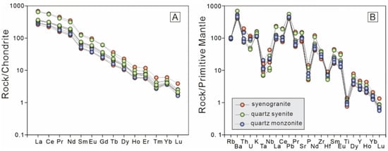 (A) Chondrite-normalized REE patterns [36]; (B) Primitive mantle-normalized trace element patterns [37].