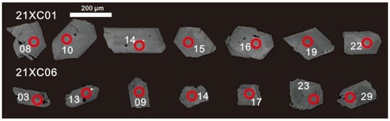 BSE image of sphene grains from syenogranite and quartz monzonite. The red circles indicate spots of LA-ICP-MS U-Pb dating.