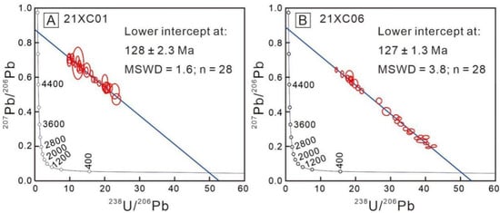 Sphene grains from syenogranite (21XC01) are euhedral–subhedral and range from 180 to 300 μm in size, with length-to-width ratios of from 1:1 to 2:1 (Figure 6). Twenty-eight spots were analyzed on 28 grains. The 28 analyses yield lower intercept dates of 128 ± 2.3 Ma (2σ, n = 28, MSWD = 1.6) (Figure 7A). The Th contents range from 163 to 505 ppm and U contents range from 22 to 110 ppm. They show Th/U ratios of 4.4 to 10.3 (Table 2).