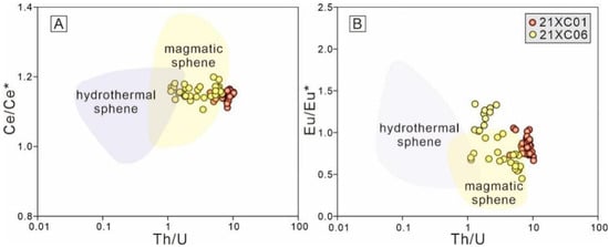 Sphene origin discrimination diagrams. (A) Ce/Ce* vs. Th/U [42] and (B) Eu/Eu* vs. Th/U [42] for the sphene from syenogranite and quartz monzonite.