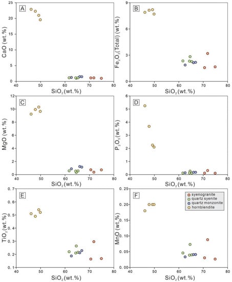 (A–F) SiO2 vs. selected major elements showing variable trends for hornblendite, syenogranite, quartz syenite and quartz monzonite [8]. Major elements contents of hornblendite are taken from [7].