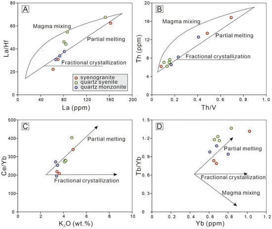 Compositional variation diagrams of (A) La/Hf vs. La [45], (B) Th vs. Th/V [45], (C) Ce/Yb vs. K2O [21] and (D) Tb/Yb vs. Yb [21] for the alkaline rocks showing partial melting.