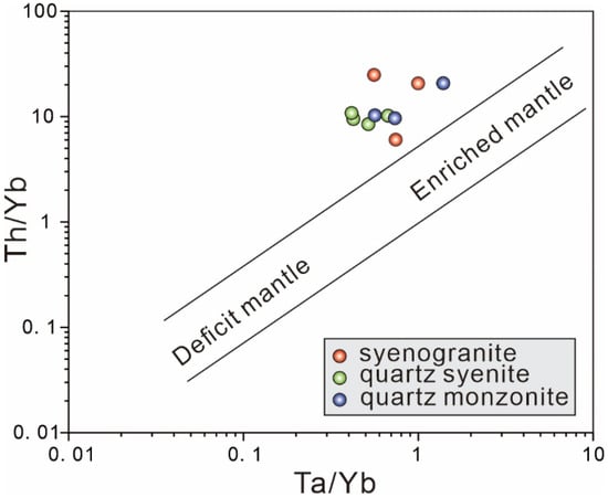 The Yanshanian orogenesis, correlated with the subduction of the Izanagi plate, resulted in widespread magmatism and ore formation in the Luxi Terrane [1,2,3], and formed a series of alkaline intrusive rocks and rare-earth element (REE) deposits in eastern China. Such REE deposits comprise the Weishan, Longbaoshan and Guandimiao REE deposits, which are spatially hosted by NW- and NWW-oriented faults [1,2,3,4,5]. Previous studies on the Early Cretaceous alkaline rocks in the Luxi Terrane indicate that the petrogenesis of the alkaline rocks remains controversial [6,7,8,9]. Previous studies proposed that decreases in TiO2, Al2O3, Fe2O3 (Total), MnO, MgO, CaO and P2O5 with an increasing SiO2 of the Weishan and Longbaoshan alkaline complex were caused by fractional crystallization [5,6,8]. The presence of inherited zircon grains (2639–2494 Ma) in the Weishan and Longbaoshan complex is evidence of crustal contamination [5,6,8]. Moreover, as the SiO2 contents increase, the Longbaoshan alkaline complex shows lower (87Sr/86Sr)i ratios and higher εNd(t) values, suggesting that the alkaline complex might have assimilated some crustal materials [8]. Liu et al. [7] interprets the positive correlation between La/Sm ratios and La abundance of the pyroxene syenite as partial melting, and the La/Sm ratios remain unchanged, with the increasing La content of the hornblendite as fractional crystallization for the Guandimiao complex. The presence of inherited zircon grains (2553–2178 Ma) from the pyroxene syenite of the Guandimiao complex suggests crustal contamination during magma emplacement [7]. The Guandimiao complex is composed of pyroxenites, hornblendites, dioritic porphyries, pyroxene syenites, quartz syenites, syenogranites and quartz monzonites, representing a fractionation sequence [7,10]. Previous studies have investigated the petrogenesis of the hornblendites and pyroxene syenites and proposed a fractional crystallization and partial melting model, with crust material contamination [7]. The petrogenesis of the alkaline sequence, including quartz syenites, syenogranites and quartz monzonites, however, remains ambiguous.