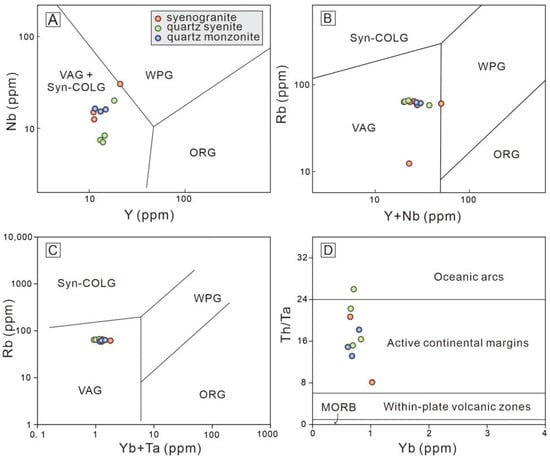 Tectonic implications discrimination diagrams (A) Nb vs. Y, (B) Rb vs. (Y + Nb) [70], (C) Rb vs. (Yb + Ta), (D) Th/Ta vs. Yb [48]. Abbreviations: VAG: Volcanic arc granites, Syn-COLG: Syn-collisional granites, WPG: Within plate granites, ORG: Ocean ridge granites.