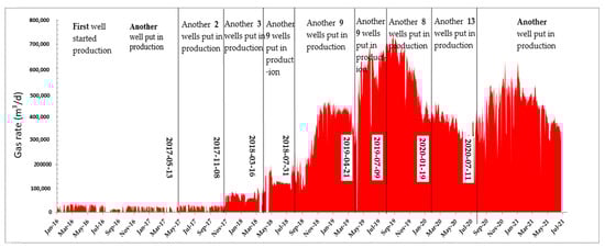 Located in the eastern Ordos basin of China, the Y field spans as large as 107.1 km2 and is estimated to have a gas reserve of 1.08 × 1010 m3. The formation (Shihezi), consisting of eight pay beds (He1 to He8), was deposited under a braided delta system and the thickness of the pay beds ranges from 1.5 m to 12.5 m. The characteristics of core samples show that porosity ranges from 8% to 14%, air permeability from 0.2 to 3.0 mD, and gas saturation from 40% to 80%. The production history of the Y field is provided in Figure 1. The first well was initiated into production in January 2016 and the second well was put into production in May 2017. From then on, more and more wells were constantly drilled and completed for production. The peak gas rate of the field reached 72 × 104 m3/d in October 2019 with 34 wells in production. In general, from April 2019, the gas rate started to show an obvious decline and only drilling more wells could compensate for the declining trend. After the peak rate, however, even though more new wells were completed to increase production, the total gas rate could not bounce back. Currently, 56 wells are in production in the field with a daily gas rate fluctuating around 50 × 104 m3/d. Of all of the wells, 45 are hydraulically fractured and 11 are not fractured. This is the tough reality that the industry has to face in tight gas field exploitation; it is subject to rapid field rate decline. To increase economic gains and enhance ultimate recovery, with years of production data and experiences, a systematical study-based production dynamics analysis to improve the understanding of the formations and their flow characteristics is necessary and a suite of techniques for post-fracturing production data analysis needs to be established.