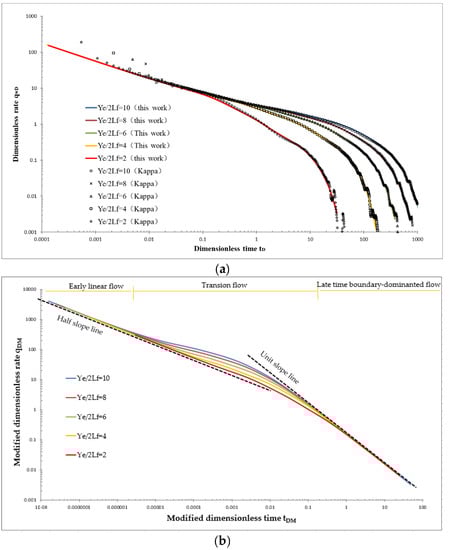 The curves in terms of , illustrated in Figure 3a, are converted using Equations (3)–(5) and are replotted in the form of in Figure 3b. Note that the datasets with the reservoir information are documented in Appendix A to provide the opportunity of reproducing the type curves if interested. One can observe the significant feature update of the curves, especially in terms of the shapes of the group of the new type curves. In more detail, all curves fall on the same stem during early linear flow with a 1/2 slope decline trend and also on the same stem at late boundary-dominated flow (BDF) with a unit slope decline trend. This provides a unique feature for the type curve matching process and is the most innovative contribution of the modified dimensionless type curves for MHFHW. The modified type curves help identify field data diagnostics for various flow regime changes of fractured wells and also facilitate the curve matching process with real data to obtain the key information of a reservoir-fracture system.