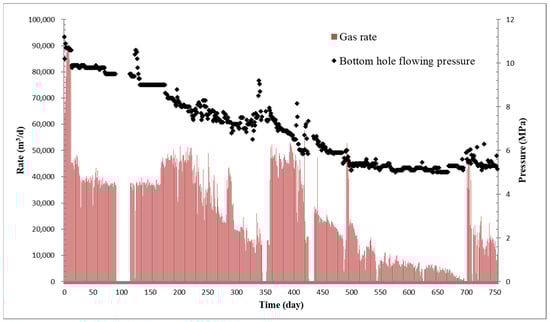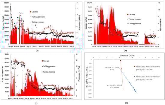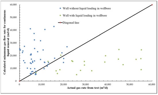 The traditional approach requires a forward tubing flow model to calculate the value of the model coefficient, X in Equation (16), to generate MPR curve. Different forward models, however, result in different values of X ranging from 2.5 to 6.5, causing uncertainties. Lu et al. [9] proposed a simple and applicable method to solve this problem. By making use of flowing pressure gradient tests of producing gas wells, water accumulation status of a well that encounters liquid loading in wellbore can be readily recognized. Figure 13 shows the calculated minimum gas flow rate resulting with X = 2.8 versus the real gas well flow rate of the 35 wells in the study field. It is observable that a reasonably satisfying alignment near the 45° diagonal line can be achieved. Then, the MPR curve can be generated properly.
