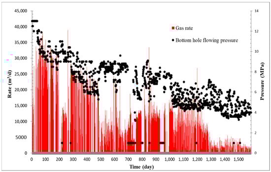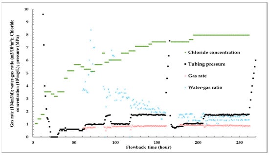 When a gas well is considered to have water production, its level of water production severity is characterized by the water–gas ratio (WGR) measured during flowback period when liquid rate, gas rate, tubing pressure and chloride concentration are stable. For example, as shown in Figure 10, after 120 h of flowback subsequent to fracturing treatment, data dynamics are stable and WGR approximately arrives at 1.5 m3/104 m3.