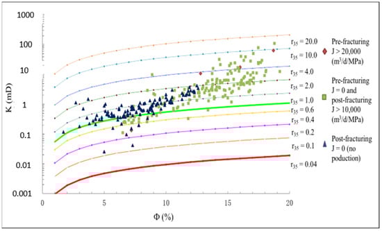 With the application of Equation (15), a porosity-permeability crossplot under various r35 values is established and presented in Figure 8, including data from 291 core samples of Y field. The red dots represent flow units with commercial productivity without fracturing stimulation, and the green dots represent flow units that are unable to achieve commercial productivity without fracturing operations but acquire productivity after fracturing, whereas the dark blue dots represent flow units that do not achieve commercial productivity even after fracturing. As illustrated in Figure 8, in general, a formation with r35 greater than 4.0 does not require fracturing to produce, while one with r35 greater than 1 and less than 4 needs fracturing to obtain reasonable productivity. However, a formation with r35 less than 1 cannot possibly gain productivity even if fracturing stimulation is applied.