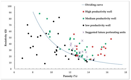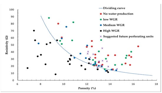 Based on well logging information of all 56 wells, including He1 to He8 other than He5, 16 sandstone flow units, which were initially ignored and not perforated to produce by all of the 12 wells, are found to have corresponding porosity-resistivity characteristics that fall in the medium-to-high productivity area in Figure 11 and also fall in the medium-to-low WGR area in Figure 12. Table 5 summarizes related information of the 12 wells. Hence, the 12 wells have the opportunity to perforate such formation for production at a late stage to enhance ultimate recovery. Additionally, in order to seek productive layers that were previously ignored by the current production wells, Figure 6 and Figure 7 can be applied to qualitatively predict well performance when drilling and wireline logging are completed, or to decide whether a target layer switch for perforation is necessary.