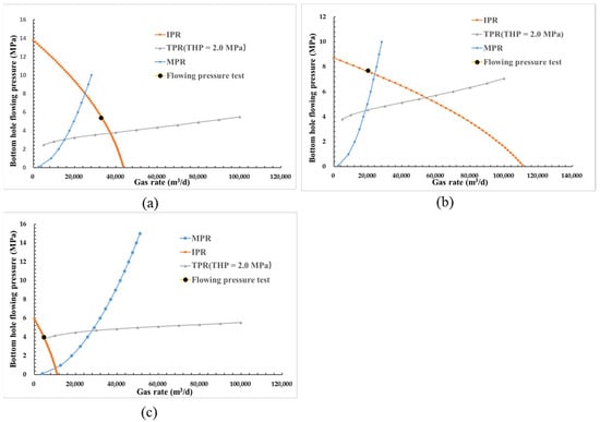 - If the operational status on current IPR curve is at the crossing point of IPR and TPR curves, and above MPR curve, as illustrated in Figure 14c, this suggests inadequate reservoir productivity and severe liquid loading in wellbore, therefore, the productivity of gas well is too low to be improved through tubing string design. A total of 12.5% of the 40 wells belong to Category 3.
