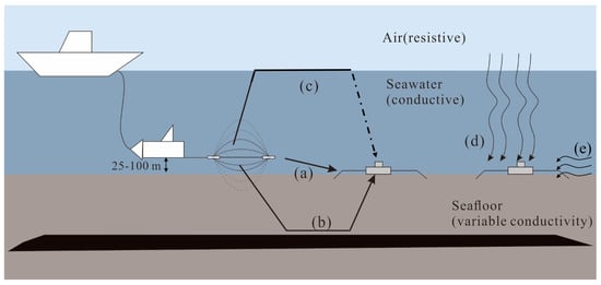 Marine CSEM is frequently used in hydrocarbon and other undersea resources exploration [1,2]. The principle and working flow of frequency domain marine CSEM are illustrated in Figure 1. A horizontal electric source, towed close to the bottom, is utilized to transmit an electromagnetic signal. Several receivers are deployed on the seafloor with a certain rule to record electromagnetic signals.