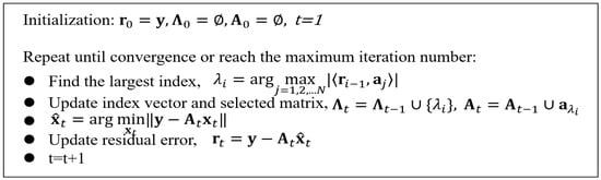 where is named dictionary and its columns named atoms, is the coefficient vector, and is the error tolerance. Especially, when there are only K non-zero coefficients in and , then the signal has a sparse representation with dictionary . The sparse representation of the target signal is closely related to the matrix . And pre-specified transform matrices, such as discrete sine transform (DST) and wavelet transform (WT) matrix, are always chosen as the dictionary [13]. The matrix can also be designed as an over-complete dictionary, in which the number of rows is larger than columns [19]. Now the widely used sparse reconstruction algorithm is orthogonal matching pursuit (OMP) [20] with the basic flow listed in Figure 2.
