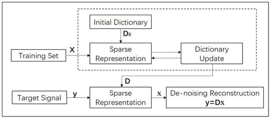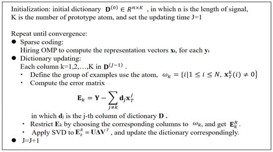 by using SVD directly. Decompose , define the solution for as the first column of and the coefficient vector as the first column of multiplied by . The algorithm flow of K-SVD is illustrated in Figure 3.
