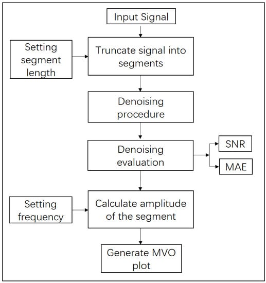 Flow chart of the denoising technique described in this article. There are three inputs including the target signal, the setting window length and frequency. Note that the denoising processing and evaluation procedure are defined for time series, and the denoising effect is illustrated through MVO plots at given frequencies.