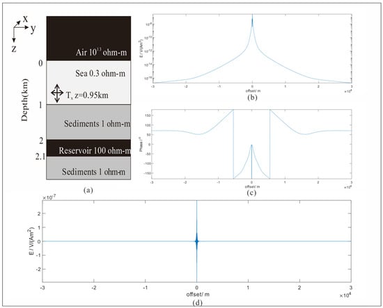 The canonical reservoir model and the CSEM response. (a) is the canonical model (comes from Myer 2011). There is a half-space air layer with the resistivity ohm-m, a 1000 m deep seawater layer with 0.3 ohm-m, and a sediment layer with 1 ohm-m. Besides, a 100 m thick and 100 ohm-m high resistive layer is buried 1000 m below the seafloor. The transmitter is dragged along Y-axis at 50 m above the seafloor. The receiver is located at the original point of Y-axis. (b) illustrates the MVO (magnitude versus offset) plot of marine CSEM signal, and the maximum value appears at the receiver location. (c) shows the PVO (phase versus offset) plot of the signal. (d) is the modulating signal to simulate the recorded signal.