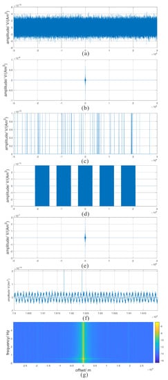 These noise types are illustrated in Figure 7a–d, corresponding to the four kinds of noise, respectively. Figure 7e is the overall view of the contaminated signal, most details are imperceptible in this overall view. Figure 7f is the partially enlarged view of Figure 7e, where it is obvious that the signal is contaminated by random noise and impulse noise. Figure 7g is the time-frequency plot of the contaminated signal, in which the impulse noise is shown as vertical stripes and five low frequency noise sources are shown as cross stripes at corresponding locations.