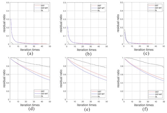 The convergent performances with three dictionaries of different segments with locations from far, middle and near offset. (a–c) are the convergence performance of intercepted raw noise free signals. (d–f) are the convergence performance of four kinds of added noise with the same locations. In this figure, DST means discrete sine transform dictionary, DST-WT represents the merged dictionary of discrete sine transform and wavelet transform, and DL represents the dictionary generated by learning method.