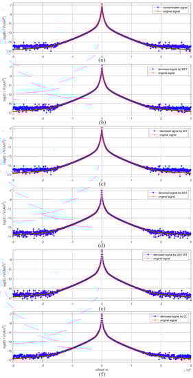 Comparing all three dictionaries (DST, DST-wavelet and the learned dictionaries) by setting the maximum iteration time to 10 and applying them to the denoising procedure, the obtained results are illustrated in Figure 9d–f. Figure 9d presents the MVO plot comparison between the noise free signal and the filtered one with DST dictionary. In general, the overall trend of the filtered signal is coincides with the noise free one. In detail, the influences of impulses are suppressed to some extent. Figure 9e presents the denoising performance under DST-wavelet merged dictionary. The denoising performance of the merged dictionary is almost the same with the DST dictionary. For impulses suppressing, the DST dictionary performs better. Figure 9f shows the results with the proposed dictionary learning based denoising approach. From the overall view, the trend of filtered signal is almost the same with others. However, the proposed approach obviously remove impulse noise when the absolute offset is larger than m. Generally speaking, the proposed approach gains the best denoising result among all these methods.