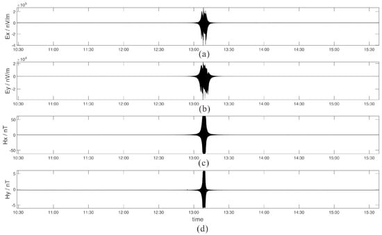 The study area is located in Qiongdongnan Basin, which is an important gas hydrate prospecting basin in the northern slope of South China Sea. The seafloor bathymetry is fairly flat, and the water depth is between 1343 m and 1354 m [31]. A 4500 m profile perpendicular to the geological strike was arranged along a NW-SE direction in the Qiongdongnan Basin. It comprises 10 sites with a space of 500 m. The main target of this article is denoising, and we select the 2nd receiver (R2) as the study object. The four time series recorded in R2, Ex, Ey, Hx and Hy, are illustrated in Figure 10.