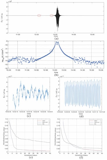 Figure 11c,d are selected from the time sequence, and their location are illustrated by the black circles in Figure 11b. It appears that the data presented in Figure 11c correspond to the part that suffers from the influence of noise and the data in Figure 11d is affected less by noise. Figure 11e is the reconstruction error of the first segment under three different dictionaries. DST and DST-wavelet dictionaries all have good convergence performance, and the performance of DST-wavelet dictionary is a little better than single DST dictionary. After 15 times of iteration, the reconstruction error stops to reduce for the learned dictionary. The reason for this phenomenon is that this segment still suffers from the influence of noise. This phenomenon changes in Figure 11f, where the target segment suffers less from noise.