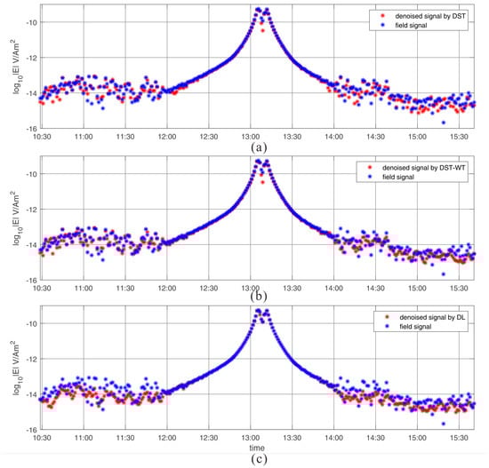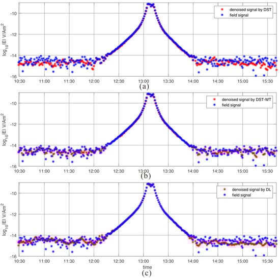 The Ey components of R2 undergo the denoising procedure by DST, DST-wavelet and learned dictionary, separately, and the results are illustrated in Figure 12 and Figure 13. Figure 12 illustrates the 0.5 Hz MVT plots with three different dictionaries, Figure 12a the DST dictionary, Figure 12b the merged dictionary and Figure 12c the learned dictionary. Compared with the scattered raw field data, the segments between 10:30 and 12:00 with three different dictionaries are less scattered, and the same phenomenon appears between 14:30 and 15:30. It yields that all three dictionaries suppress noise successfully at large offset. Especially the segment between 14:00 and 14:30, the proposed approach presents obvious centralized characteristic. Considering the morphology of simulated signal, here we deduce that the proposed method yields the best denoising results.