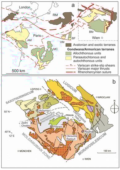 (a): A sketch of the Variscan belt of Central and Western Europe (following [19]); (b): simplified geological map of the Bohemian Massif and location of the uranium deposits discussed in the text. Abbreviations in (a): BM: Bohemian Massif; MC: Massif Central; AM: Armorican Massif; BF: Black Forest; VM: Vosges Massif; RM: Rhenish Massif. Abbreviations in (b): MZ: Moldanubian zone (allochthonous unit); Gr: Pre-Variscan and Variscan granitoids; TBU: Teplá–Barrandian Zone (Neoproterozoic and Lower Paleozoic sediments and volcanites); SAXTHUR: Saxothuringian Zone (para-autochthonous and autochthonous units);WS: West Sudetes (paraautochthonous and allochthonous units);LU: Lugian Zone (exotic terrane and autochthonous units); MSZ: Moravian–Silesian Zone (exotic or Avalonian units); CB: Culm basin; PC: Platform cover (Cretaceous and Tertiary sediments).