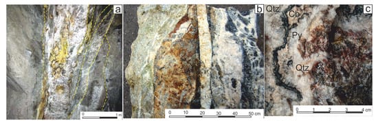 Macrostructures of the quartz–carbonate–sulfide vein with synchysite. (a): The synchysite-bearing vein mainly consists of quartz–carbonate and is locally separated from the albitized and graphitized gneiss host rocks by small structures of brittle deformation (yellow dashed lines). Yellow–green coatings on the vein surface, which comprise a mixture of jarosite and secondary uranium minerals, indicate the presence of fragments of older uranium mineralization. (b): The vein comprises several generations of calcite and quartz, and it encloses abundant clasts of host rocks along its edges. (c): Single generations of predominantly quartz and calcite sections of the vein are very often separated by up to 5 mm thick accumulations of authigenic pyrite and marcasite. The synchysite is bound to quartz-rich sections of the vein that are strongly colored by hematite. Explanations: Cb: Carbonate; Qtz: quartz; Py: pyrite.