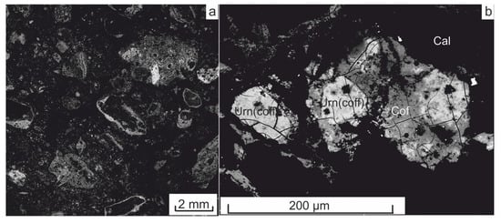(a): The BSE image of breccia with uranium mineralization (white spots) embedded in the carbonate filling of the synchysite-bearing vein. (b): Close-up of the coffinitized uraninite and coffinite in the breccia fragment. An irregular shape of the coffinite accumulations indicate its corrosion and dissolution. Explanation: Urn(cof): coffinitized uraninite; Cof: coffinite; Cal: calcite.