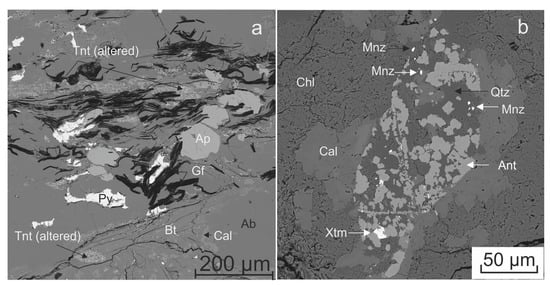 (a): The BSE image of the chloritized and graphitized host rock with hydrothermally decomposed titanite grains. (b): Close-up of the hydrothermally altered titanite grain decomposed to anatase, quartz, calcite, monazite, and xenotime (white grains) in the chloritized matrix of the host rock of the synchysite-bearing vein. Explanation of symbols: Ap: apatite; Ab: albite; Ant: anatase; Bt: biotite (chloritized); Cal: calcite; Gf: graphite; Ch: chlorite; Mnz: monazite; Py: pyrite; Tnt (altered): hydrothermally altered titanite; Xtm: xenotime.