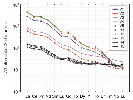 C3 chondrite–normalized REE distribution in the quartz–carbonate–sulfide vein with synchysite and the host rocks. (whole rock data were normalized following [35]). Explanation: veins V1–V3: quartz-dominated section of the vein; V4: quartz and carbonate filling; V5: carbonate-rich section of the vein; host rocks H1–H4: chloritized, argillized, and albitized gneisses; H5: slightly chloritized gneiss.