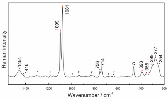 The Raman spectrum of the synchysite in the quartz gangue of the studied quartz–carbonate–sulfide vein in Rožná was found to display a number of Raman bands. The strongest Raman features were found at 1081 and 1099 cm−1, and these represent the ν1 symmetric stretching mode of the (CO3) group (Figure 8). In contrast to most carbonates, which usually have one v1 band, the splitting of bands observable in this region typically implies at least two distinct site symmetries for the (CO3) groups [37,38]. A broad band around 1454 cm−1 and a weak band at 1416 cm−1 were caused by the ν3 asymmetric stretching mode of (CO3). Other bands that may be obviously assigned to the carbonate group were found at 741 and 756 cm−1, which are associated with the ν4 in-plane bending mode of (CO3). Numerous bands were observed below 600 cm−1 at 254, 277, 299, 355, and 393 cm−1. These can be best-described as lattice modes, although Raman bands of any internal modes involving a fluorine atom would also be detected in this spectral region for halogen-containing carbonates [39]. Altogether, the Raman spectrum of synchysite studied in the Rožná deposit can be compared with the spectrum of synchysite-(Ce) reported by Alles et al. [40].